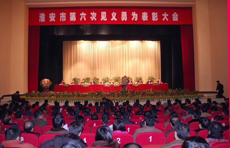 12月24日上午,我市在淮安人民大會堂召開第六次見義勇為表彰大會,對全市58名見義勇為先進個人進行表彰。會議由市委常委、秘書長、常務副市長陳洪玉主持,副市長、公安局長倪興余宣讀了《市政府關于表彰見義勇為先進個人的通報》,市見義勇為基金會理事長李繼堯宣讀了《市見義勇為基金會關于給唐子年等同志頒發(fā)獎金和撫恤金的決定》,兩名見義勇為先進個人代表在會上發(fā)言,市委書記劉永忠同志到會并作重要講話。市政協主席王維凱,市人大代理主任范學恕,市局副局長徐乾,市局黨委委員、政治部主任王國慶及各縣(區(qū))委、政府、市經濟開發(fā)區(qū)管委會分管負責人,公安(分)局局長、政委,市法院、檢察院分管負責人;市委各部委辦、市各委辦局、市各直屬單位、部省屬駐淮單位、市各大中專院校分管負責人,部分大中專院校學生以及市各新聞單位的記者共1500人參加了會議。