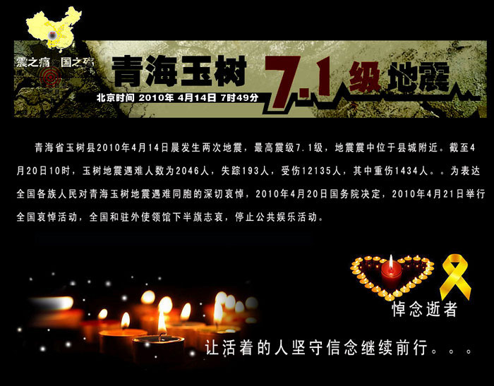 新華社4月20日電 為表達(dá)全國(guó)各族人民對(duì)青海玉樹地震遇難同胞的深切哀悼,國(guó)務(wù)院決定,2010年4月21日舉行全國(guó)哀悼活動(dòng),全國(guó)和駐外使領(lǐng)館下半旗志哀,停止公共娛樂活動(dòng)。